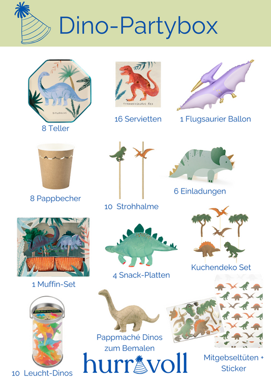 Planst du einen spannende Dino-Kindergeburtstag für kleine Forscher? Unsere Dino-Mottobox bietet alles, was du für einen unvergesslichen Kindergeburtstag brauchst! Mit hochwertigen Einladungskarten kannst du deine Gäste stilvoll einladen, während die liebevoll gestaltete Partydekoration für eine authentische Dino-Atmosphäre sorgt.