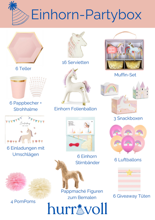 Komm mit ins magische Einhorn-Land… Alle Kinder verkleiden sich zu Beginn des Kindergeburtstags mit den beiliegenden Einhorn-Stirnbänder und bekommen einen Einhorn-Namen. Von zauberhafter Partydekoration bis hin zur spannenden Einhorn-Schatzsuche - am Kindergeburtstag kommt garantiert keine Langeweile auf! Entdecke jetzt den Inhalt der Box.