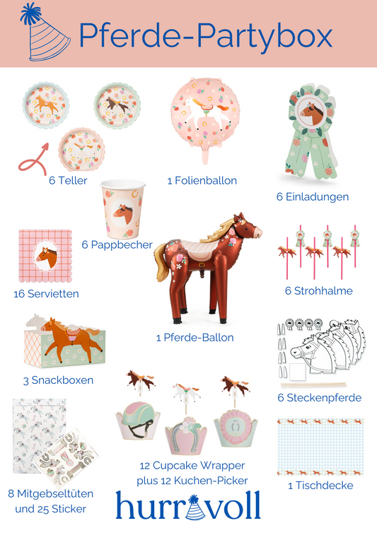In unserer Box findest du alles, was du brauchst, um einen unvergesslichen Pferde-Kindergeburtstag zu planen: von passender Pferde Partydekoration über Spiel- und Rezeptinspiration bis hin zu Bastelmaterialien. Die Kids können sogar ihre eigenen Steckenpferde basteln und bemalen und dann am großen Reitturnier mit verschiedenen Spielstationen teilnehmen. Und als krönender Abschluss gibt es für jedes Kind ein Reitabzeichen!